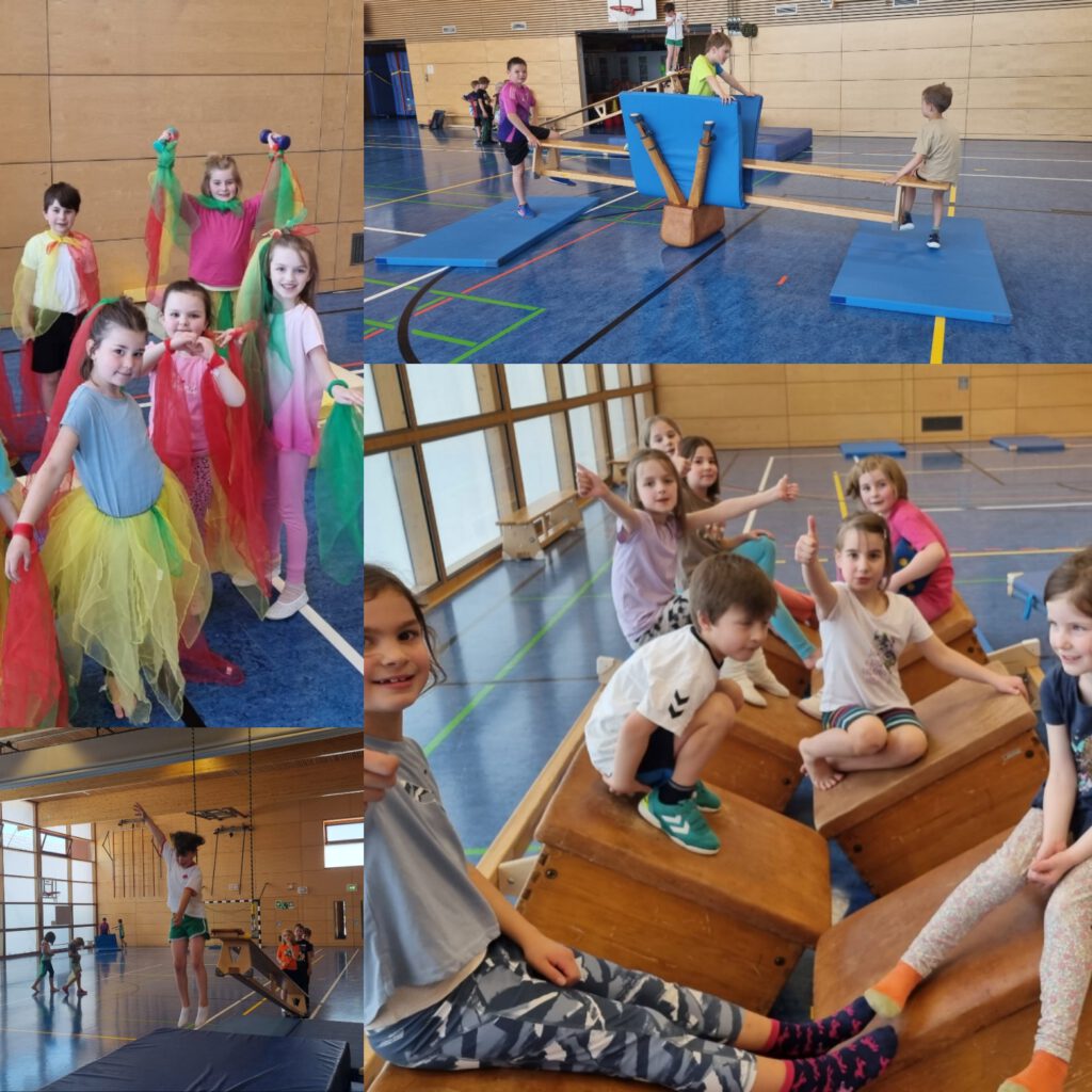 In der Turnstunde bieten wir den Kindern unterschiedliche Angebote, wie Teamspiele und aber auch Freispielzeit. Die Kinder lernen sich aufeinander abzustimmen, in der Gruppe zu kooperieren und sich auf ein Wettkampfspiel einzulassen.
